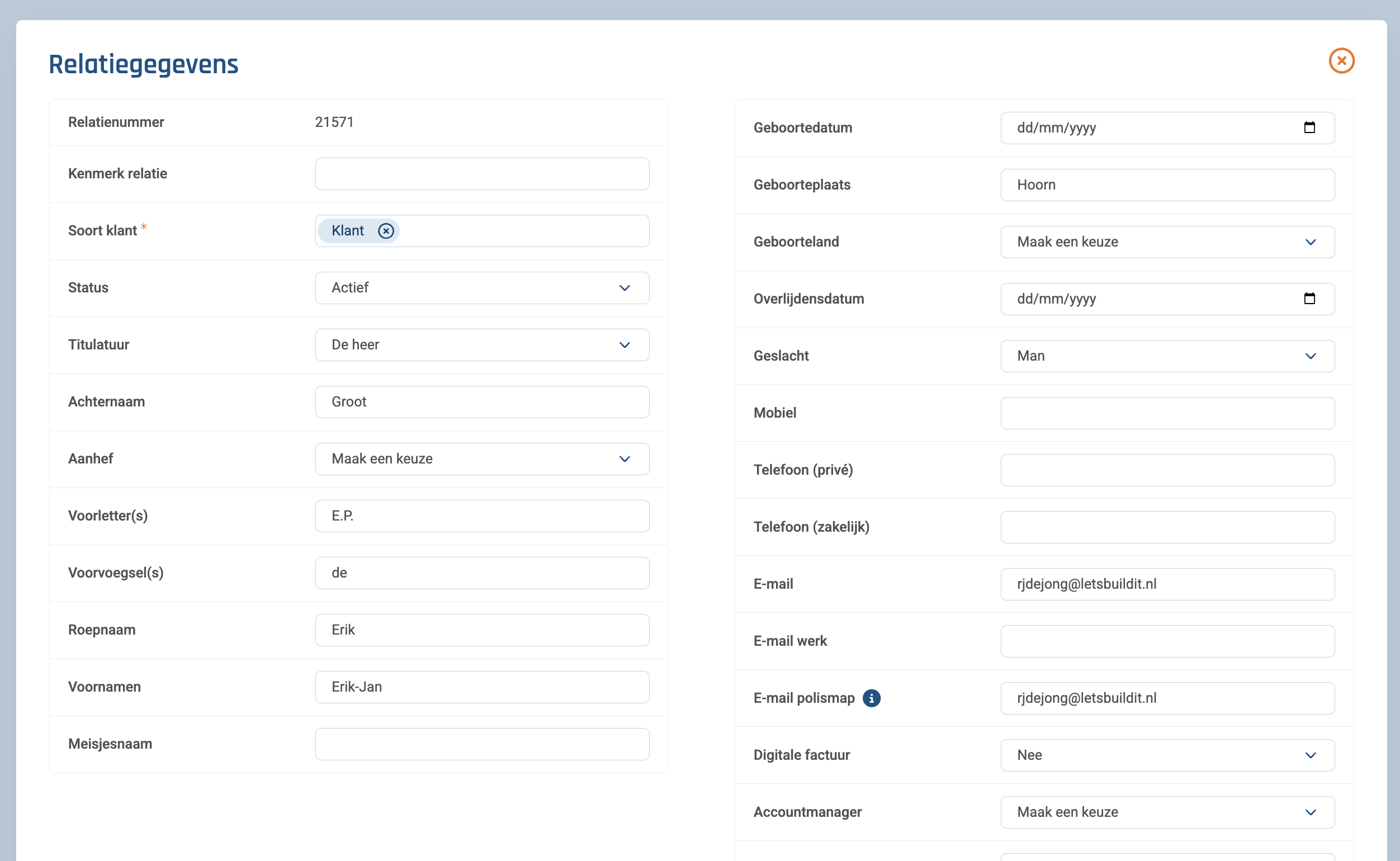 Zoek de relatie die je wilt bewerk en ga naar de relatie. Klikt rechts boven op “Muteren” om het mutatie formulier te openen. Vul uw wijzigingen in en klik onderaan het formulier op opslaan.