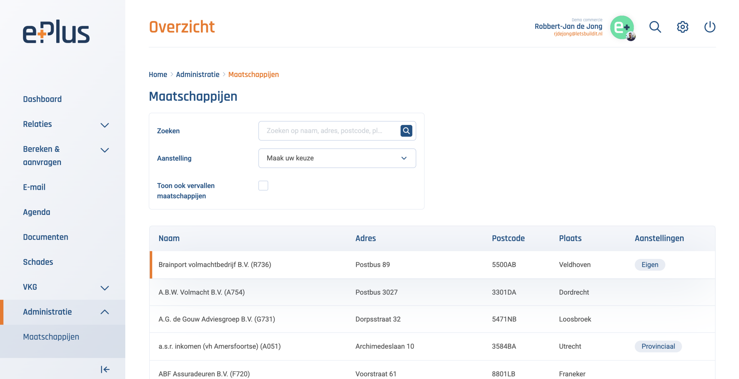 Om een maatschappij selecteerbaar te maken in ePlus dien je eerst een aanstelling in te voeren bij het maatschappijen overzicht. Dit doen wij om te voorkomen dat dit een selectbox wordt met 2.000 maatschappijen. Volg de onderstaande stappen om een aanstelling in te voeren.