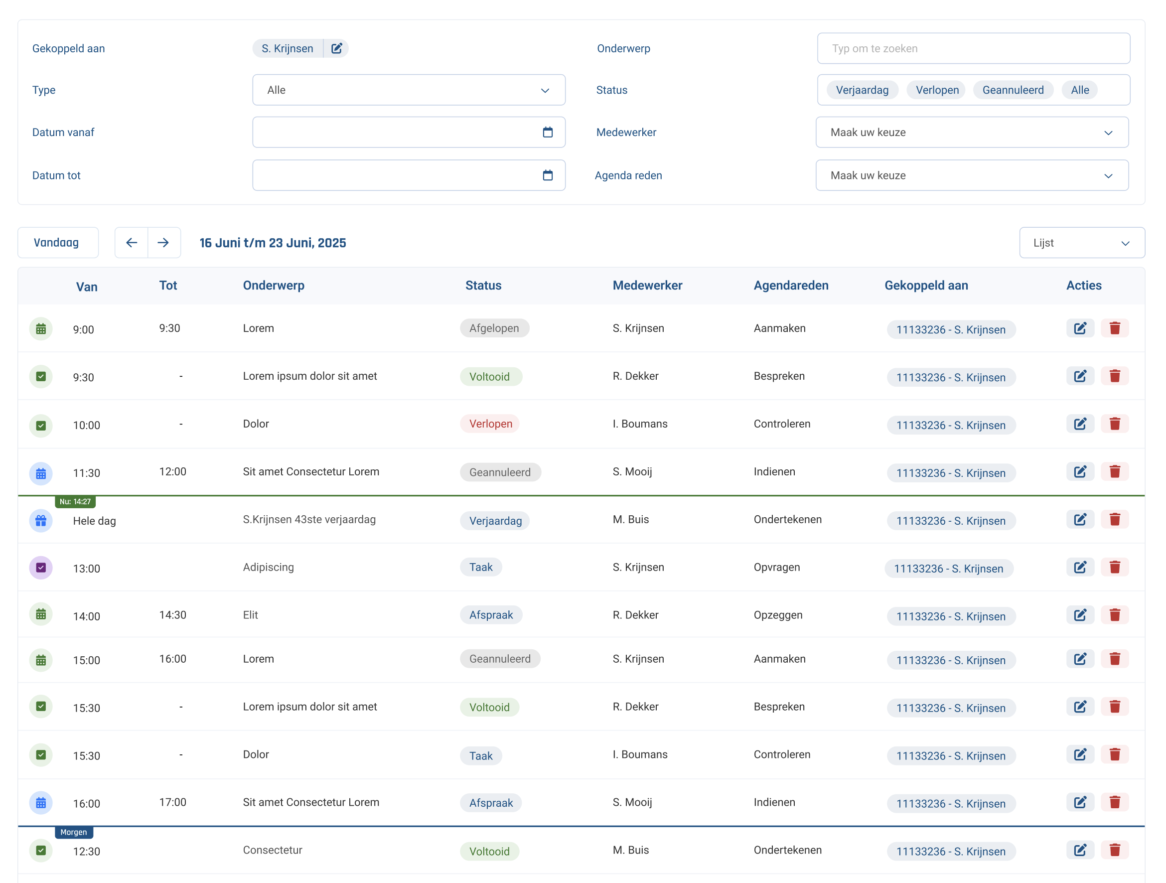De huidige versie van de agenda is een simpele lijst van agenda items die weinig onderscheid maakt tussen taken en afspraken. We willen dit duidelijker maken en betere filter mogelijkheden geven. Daarnaast zijn we ook bezig om externe agenda’s te kunnen koppelen zodat je altijd een volledige overzicht hebt van je taken en afspraken.